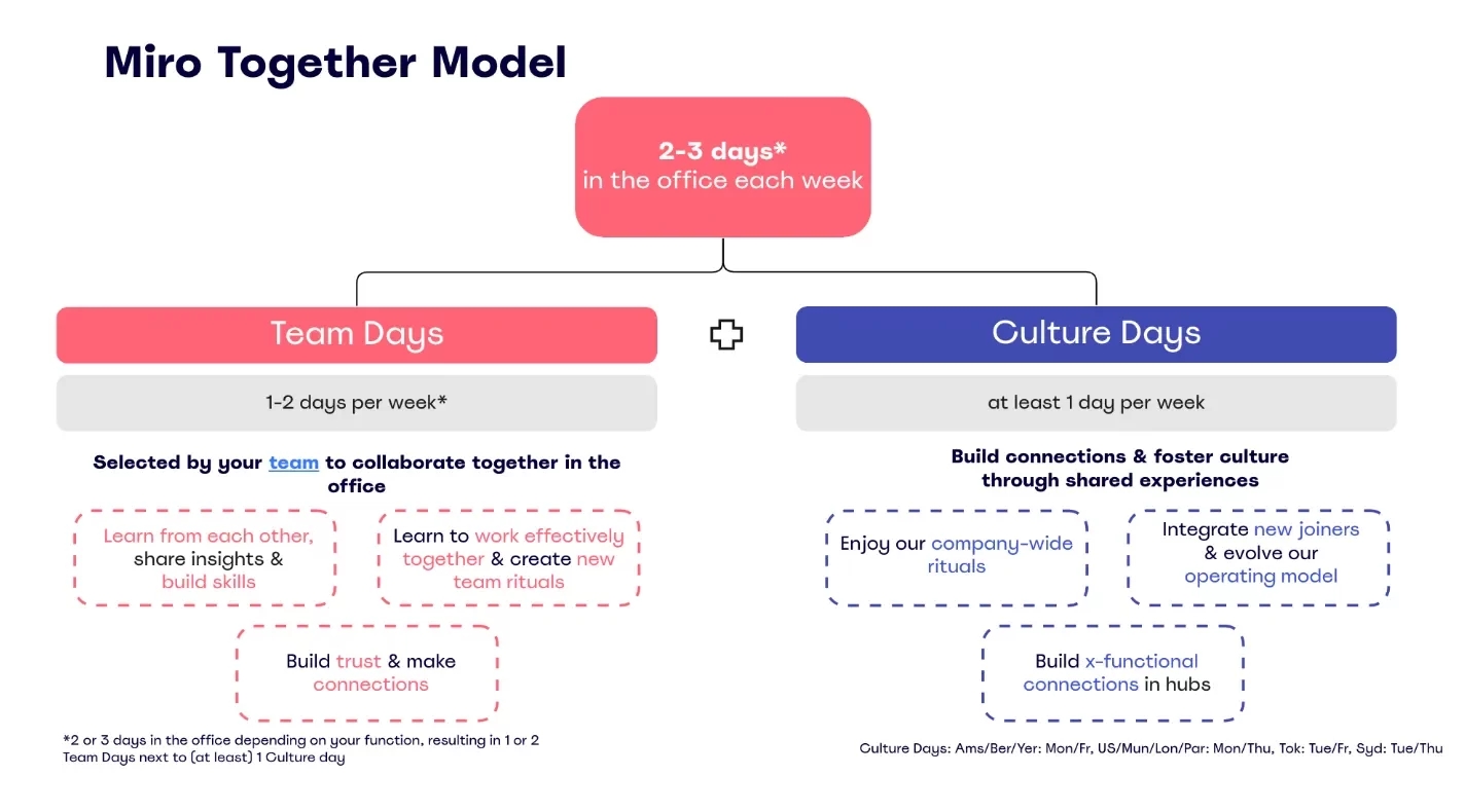 Miro Together includes a mix of dedicated “team days” and “culture days.” To achieve our strategic goals, our hybrid model includes two to three days per week in-person, depending on the person’s role. Here’s how we’re defining our categories of work days: