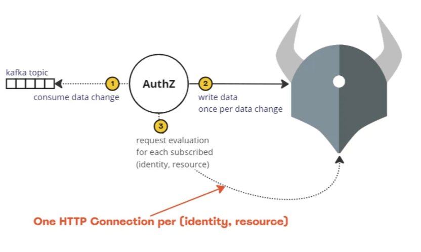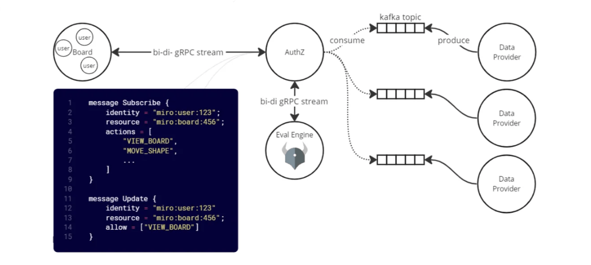 That’s how the team came up with the “streaming architecture,” which is a special operating mode for cases that need it, like on-board authorization. The idea is that clients “subscribe” to authorization changes over a bidirectional gRPC stream by specifying an identity, a resource, and a set of actions to track.