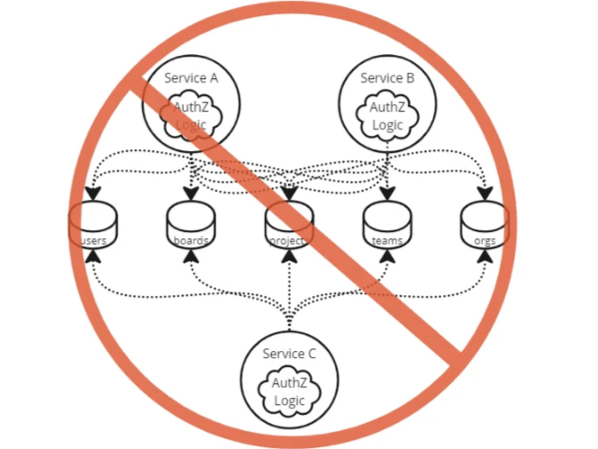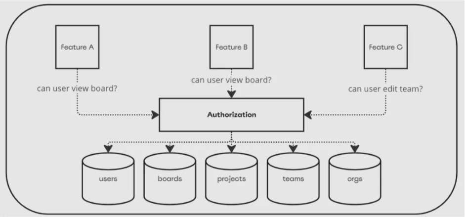 The other thing that makes it tough to extract is that it directly accesses the monolith’s data stores. If a feature needs to know if a user can view a board, it calls into the authorization code, which in turn directly fetches the data needed for that decision.