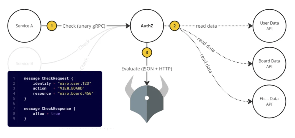 A set of standalone OPA instances takes care of pretty much everything except actually fetching the data. The AuthZ service is where we had to do the most work, because this is the part that’s Miro-specific. It’s the brains behind the operation. Its job is to integrate with the necessary data APIs, and it knows which data is needed for which authorization checks.