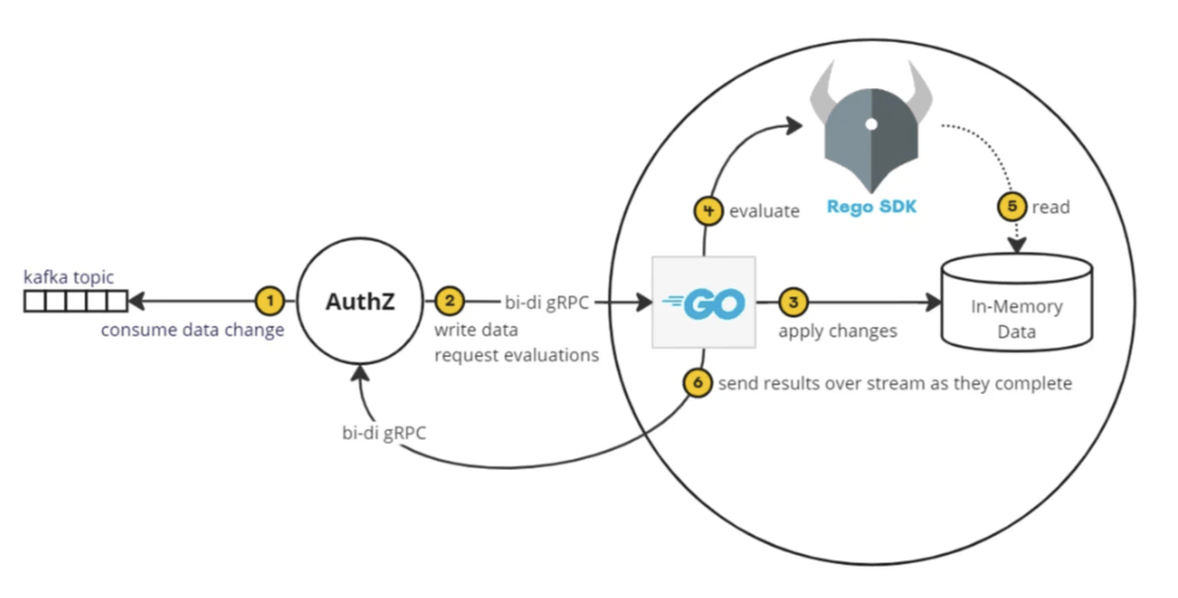We decided to explore our own solution written in Go, which is very similar to “push data,” but uses a single bidirectional gRPC stream with protobuf messages instead of JSON, and stores data in-memory in what is basically just a hashmap. The stream connection only needs to be established once, and thanks again to the versatility of OPA, we were still able to offload all the complexity of policy evaluation by leveraging the Rego SDK.